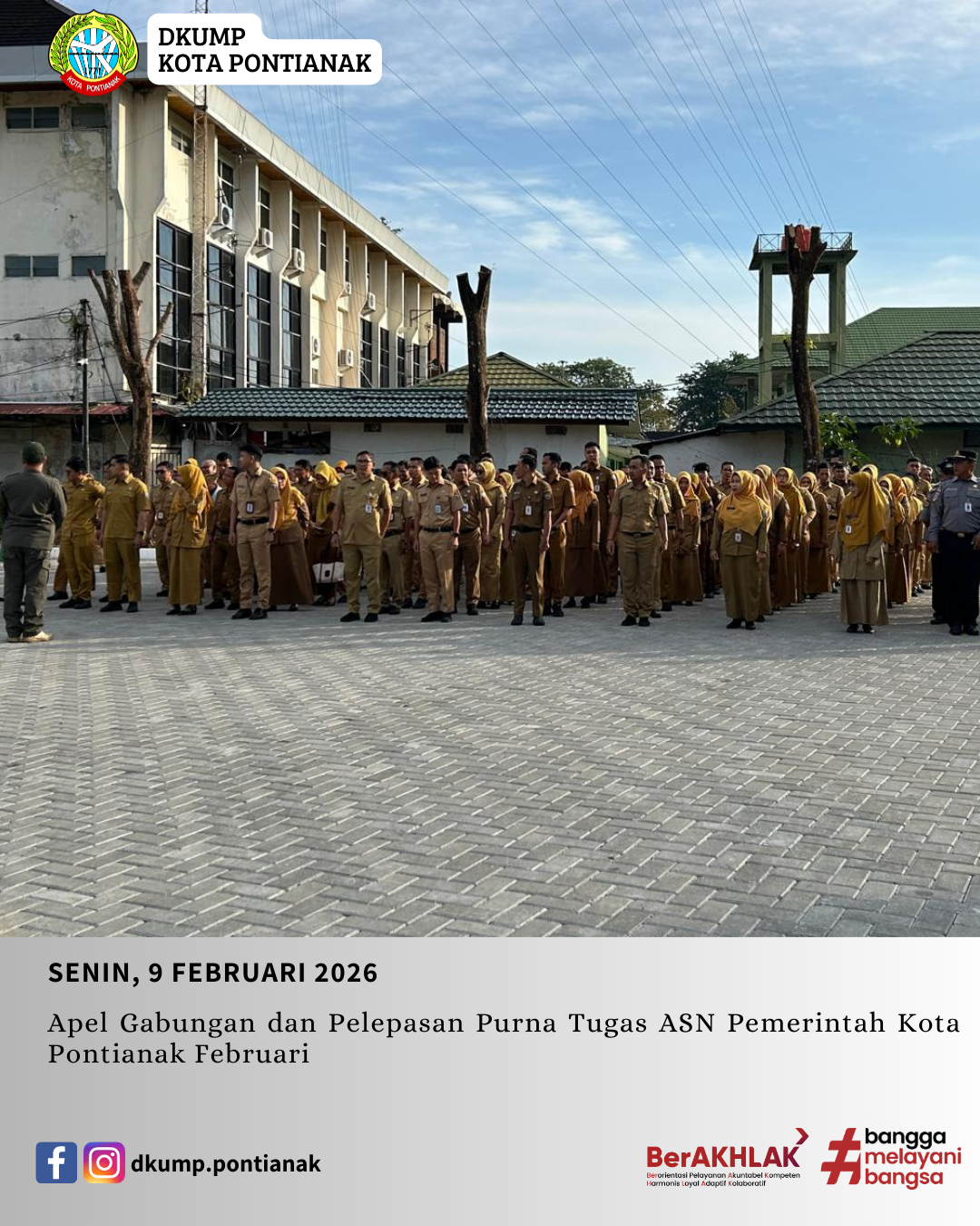 Apel Gabungan dan Pelepasan Purna Tugas ASN Pemerintah Kota Pontianak Februari Oleh: admin diskumdag 10 Feb 2026 Senin, 9 Februari 2026 Apel Gabungan dan Pelepasan Purna Tugas ASN Pemerintah Kota Pontianak Februari.