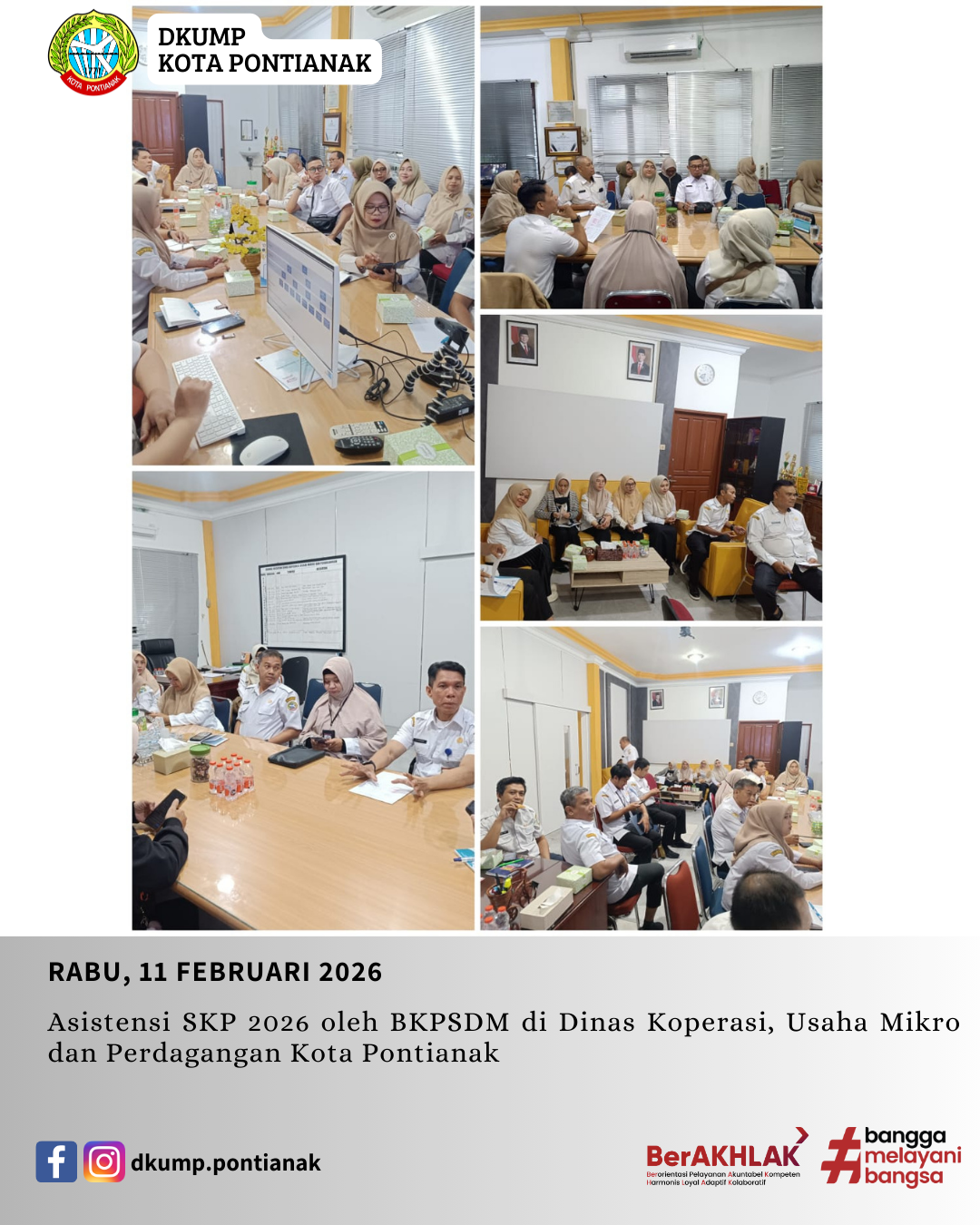 Asistensi SKP 2026 oleh BKPSDM di Dinas Koperasi, Usaha Mikro dan Perdagangan Kota Pontianak Oleh: admin diskumdag 12 Feb 2026 Rabu, 11 Februari 2026 Asistensi SKP 2026 oleh BKPSDM di Dinas Koperasi, Usaha Mikro dan Perdagangan Kota Pontianak.