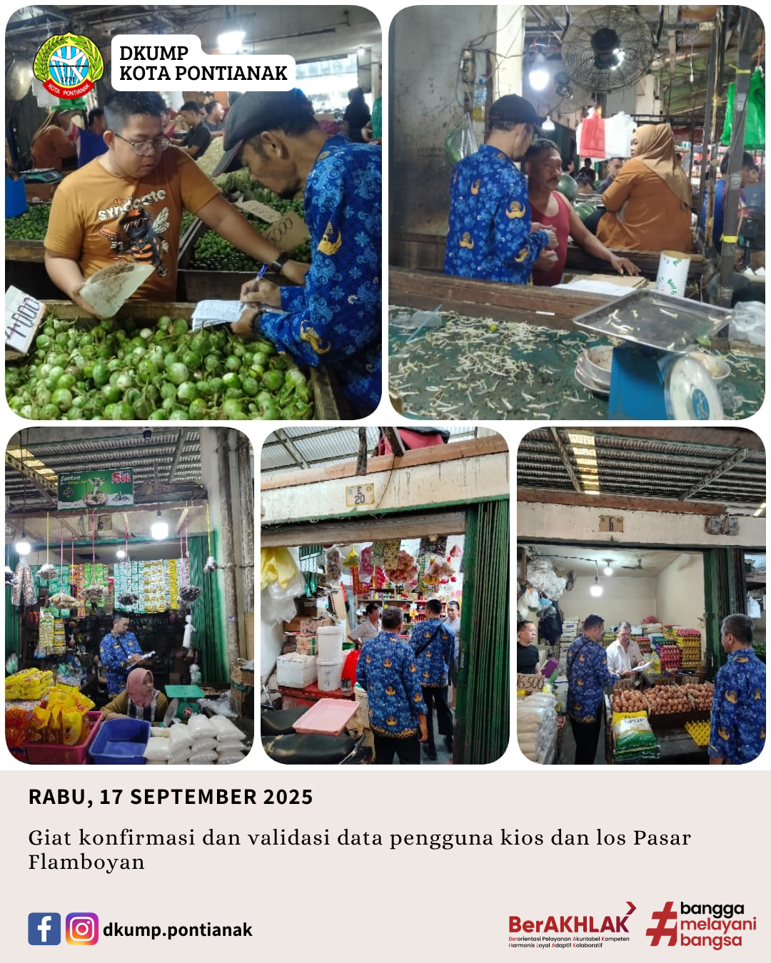 Giat konfirmasi dan validasi data pengguna kios dan los Pasar Flamboyan Oleh: Admin 17 Sep 2025 RABU, 17 SEPTEMBER 2025 Giat konfirmasi dan validasi data pengguna kios dan los Pasar Flamboyan