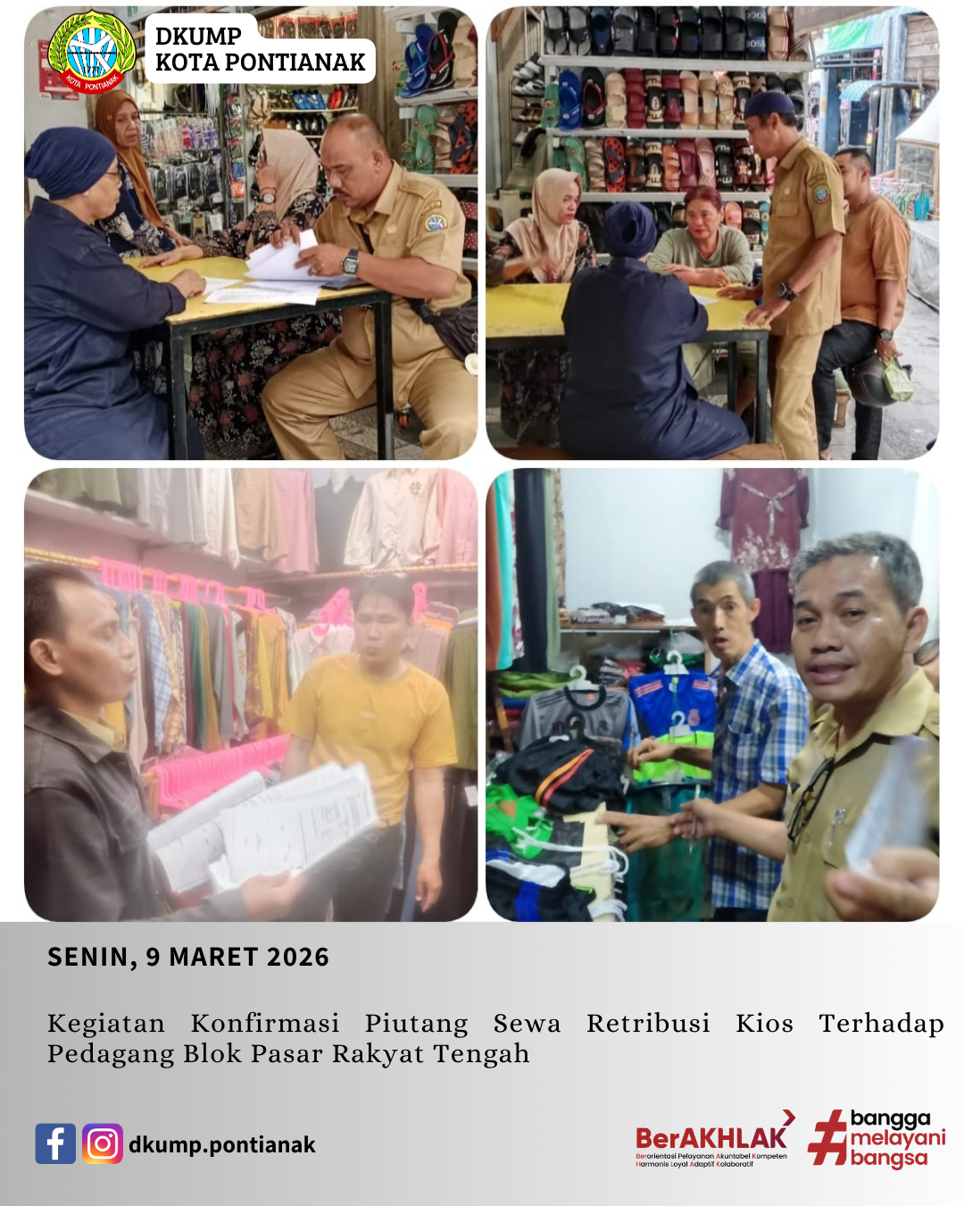 Kegiatan Konfirmasi Piutang Sewa Retribusi Kios Terhadap Pedagang Blok Pasar Rakyat Tengah Oleh: admin diskumdag 12 Mar 2026 Senin, 9 maret 2026 Kegiatan Konfirmasi Piutang Sewa Retribusi Kios Terhadap Pedagang Blok Pasar Rakyat Tengah.