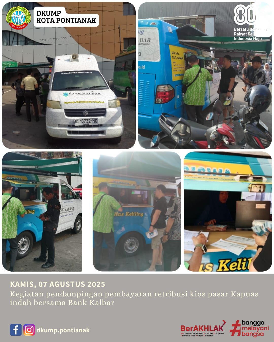 Kegiatan pendampingan pembayaran retribusi kios pasar Kapuas indah bersama Bank Kalbar Oleh: Admin 07 Aug 2025 KAMIS, 07 aGUSTUS 2025 Kegiatan pendampingan pembayaran retribusi kios pasar Kapuas indah bersama Bank Kalbar