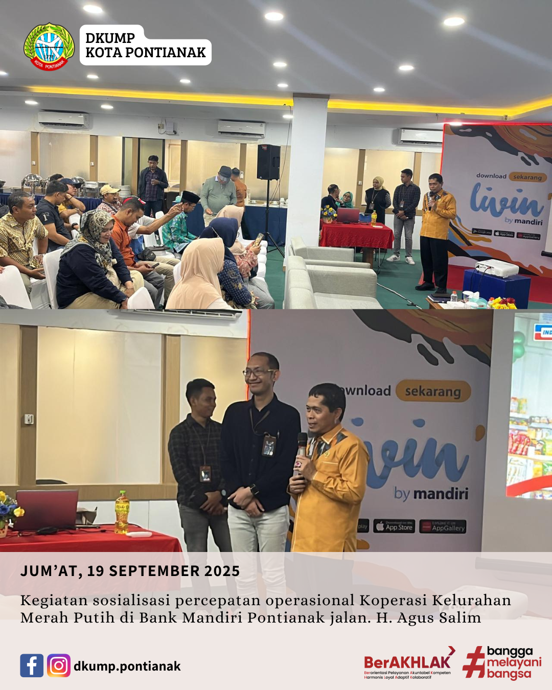 Kegiatan sosialisasi percepatan operasional Koperasi Kelurahan Merah Putih di Bank Mandiri Pontianak jalan. H. Agus Salim
