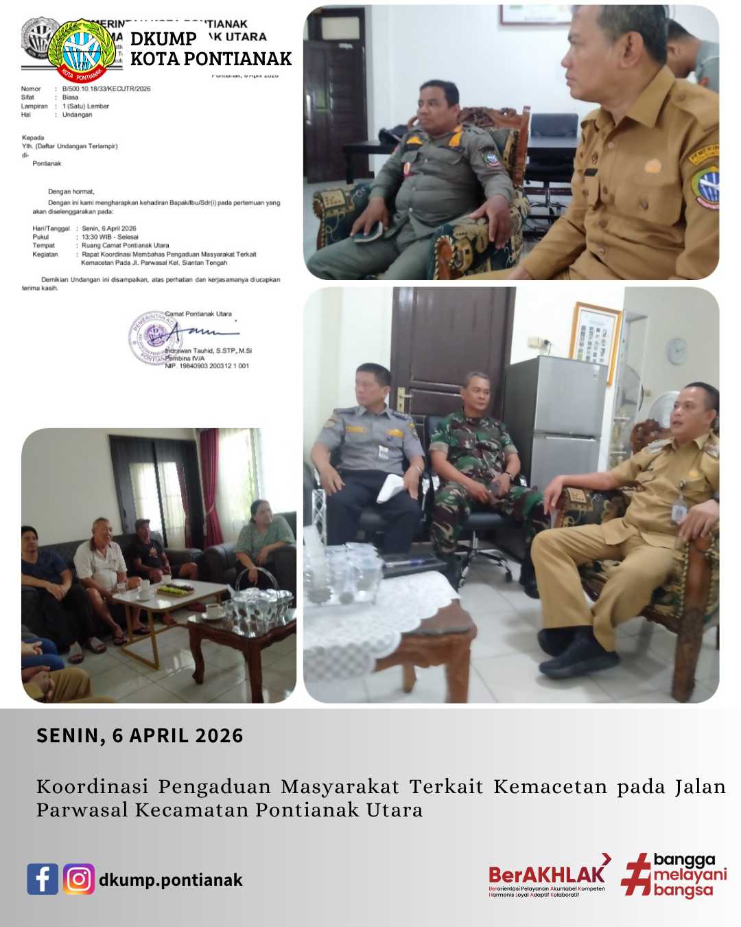 Koordinasi Pengaduan Masyarakat Terkait Kemacetan pada Jalan Parwasal Kecamatan Pontianak Utara Oleh: admin diskumdag 07 Apr 2026 Senin, 6 April 2026 Koordinasi Pengaduan Masyarakat Terkait Kemacetan pada Jalan Parwasal Kecamatan Pontianak Utara.