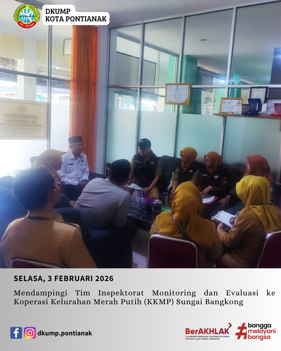 Mendampingi Tim Inspektorat Monitoring dan Evaluasi ke Koperasi Kelurahan Merah Putih (KKMP) Sungai Bangkong Oleh: admin diskumdag 05 Feb 2026 Selasa, 3 Februari 2026 Mendampingi Tim Inspektorat Monitoring dan Evaluasi ke Koperasi Kelurahan Merah Putih (KKMP) Sungai Bangkong.