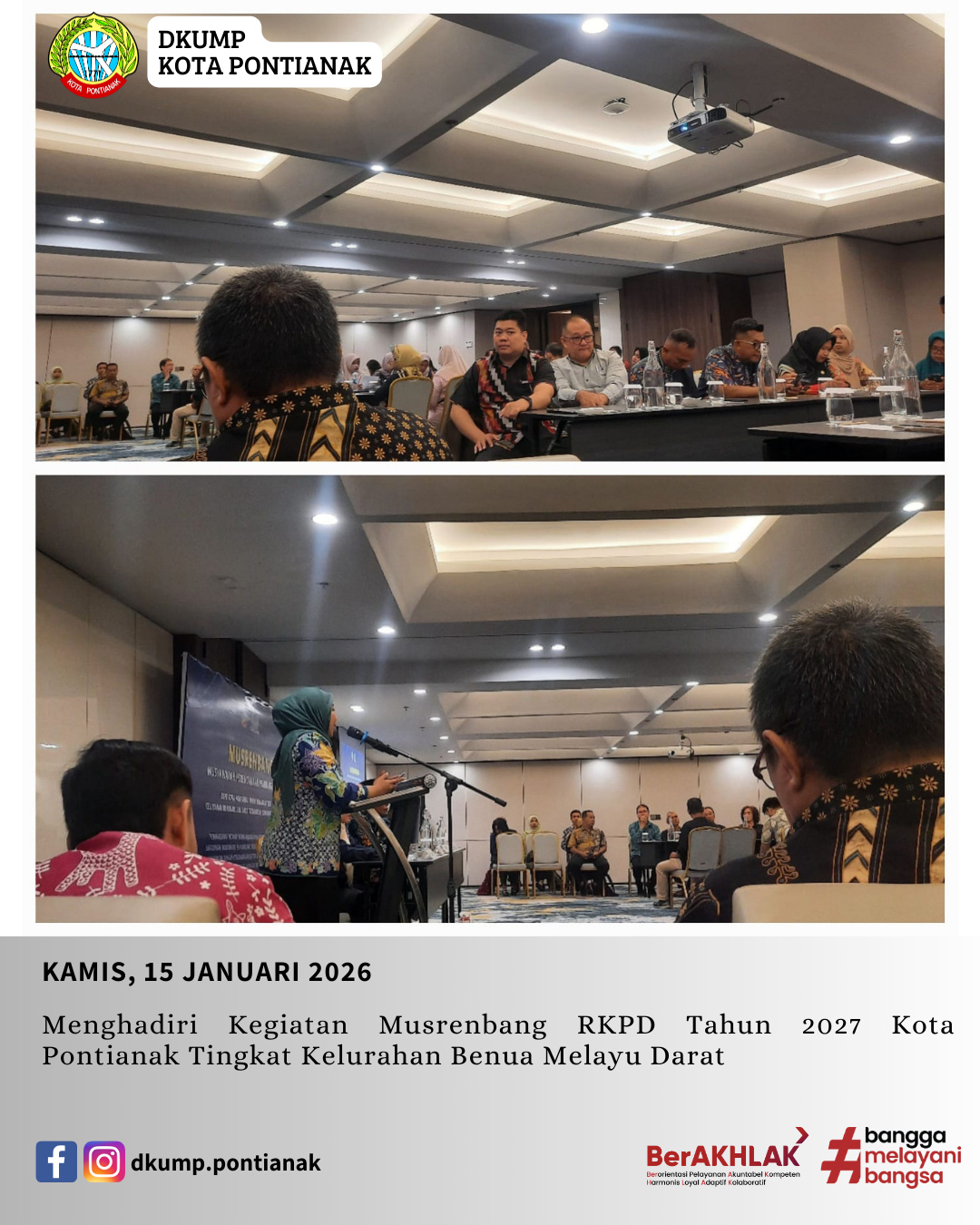 Menghadiri Kegiatan Musrenbang RKPD Tahun 2027 Kota Pontianak Tingkat Kelurahan Benua Melayu Darat Oleh: admin diskumdag 19 Jan 2026 Kamis, 15 Januari 2026 Menghadiri Kegiatan Musrenbang RKPD Tahun 2027 Kota Pontianak Tingkat Kelurahan Benua Melayu Darat.