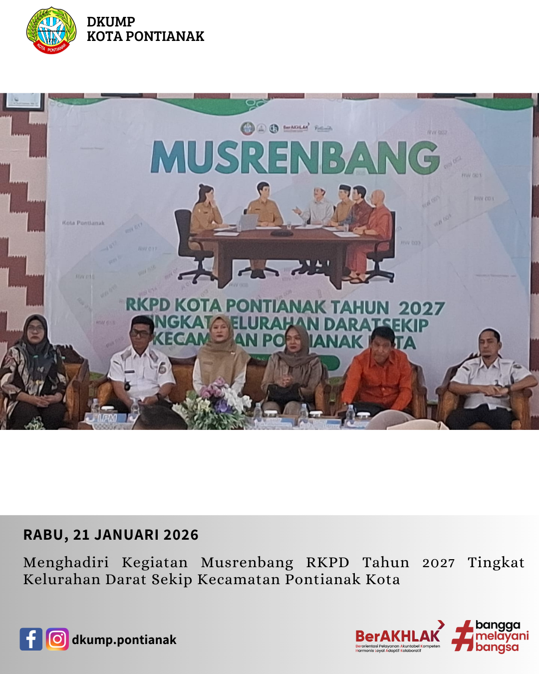Menghadiri Kegiatan Musrenbang RKPD Tahun 2027 Tingkat Kelurahan Darat Sekip Kecamatan Pontianak Kota Oleh: admin diskumdag 23 Jan 2026 Rabu, 21 Januari 2026 Menghadiri Kegiatan Musrenbang RKPD Tahun 2027 Tingkat Kelurahan Darat Sekip Kecamatan Pontianak Kota.