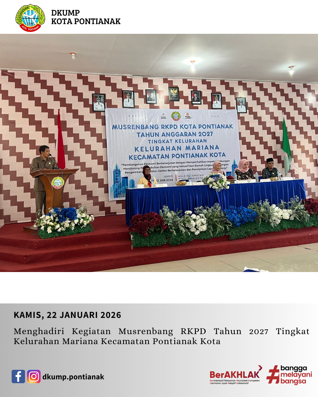 Menghadiri Kegiatan Musrenbang RKPD Tahun 2027 Tingkat Kelurahan Mariana Kecamatan Pontianak Kota Oleh: admin diskumdag 23 Jan 2026 Kamis, 22 Januari 2026 Menghadiri Kegiatan Musrenbang RKPD Tahun 2027 Tingkat Kelurahan Mariana Kecamatan Pontianak Kota.