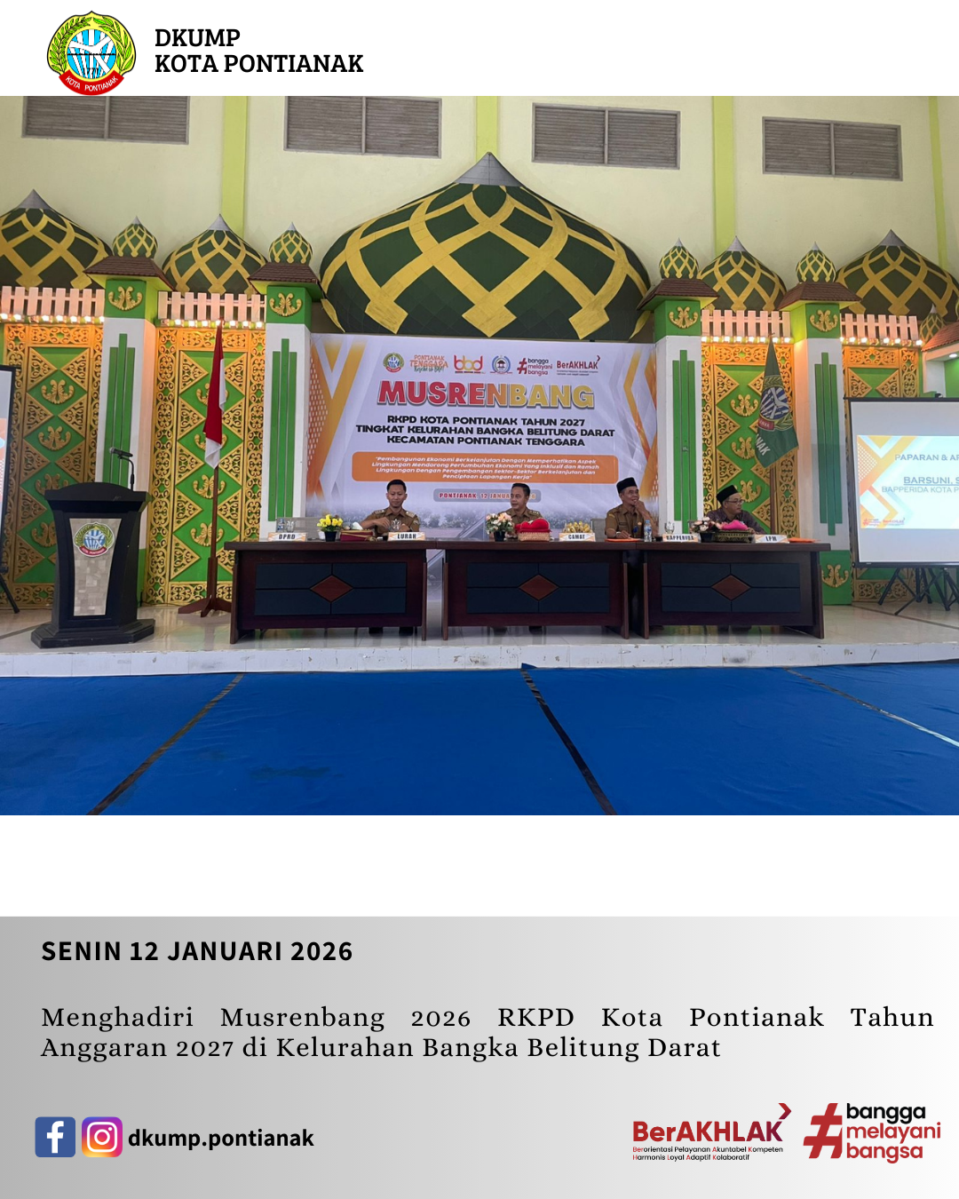 Menghadiri Musrenbang 2026 RKPD Kota Pontianak Tahun Anggaran 2027 di Kelurahan Bangka Belitung Darat Oleh: admin diskumdag 13 Jan 2026 Senin 12 Januari 2026 Menghadiri Musrenbang 2026 RKPD Kota Pontianak Tahun Anggaran 2027 di Kelurahan Bangka Belitung Darat.