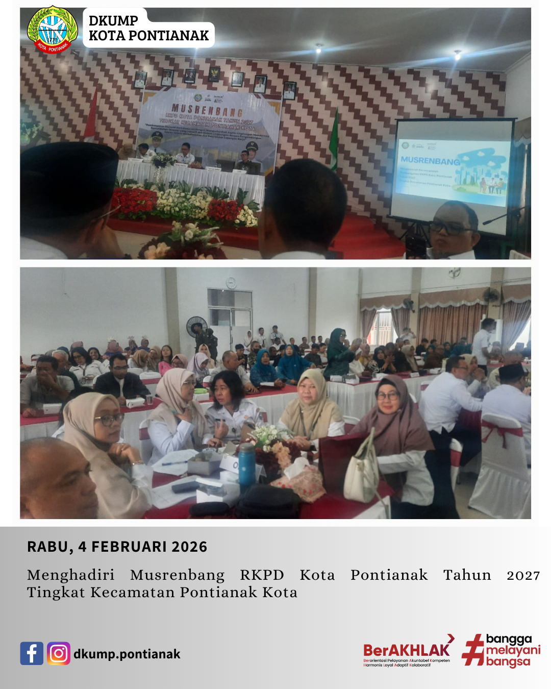 Menghadiri Musrenbang RKPD Kota Pontianak Tahun 2027 Tingkat Kecamatan Pontianak Kota Oleh: admin diskumdag 06 Feb 2026 Rabu, 4 Februari 2026 Menghadiri Musrenbang RKPD Kota Pontianak Tahun 2027 Tingkat Kecamatan Pontianak Kota.