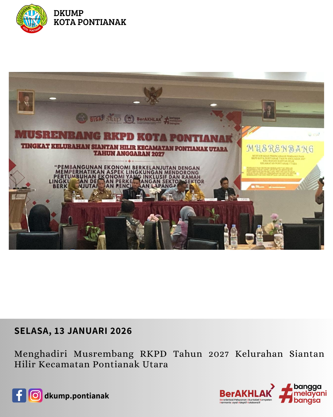 Menghadiri Musrenbang RKPD Tahun 2027 Kelurahan Siantan Hilir Kecamatan Pontianak Utara Oleh: admin diskumdag 14 Jan 2026 Selasa 13 Januari 2026 Menghadiri Musrenbang RKPD Tahun 2027 Kelurahan Siantan Hilir Kecamatan Pontianak Utara