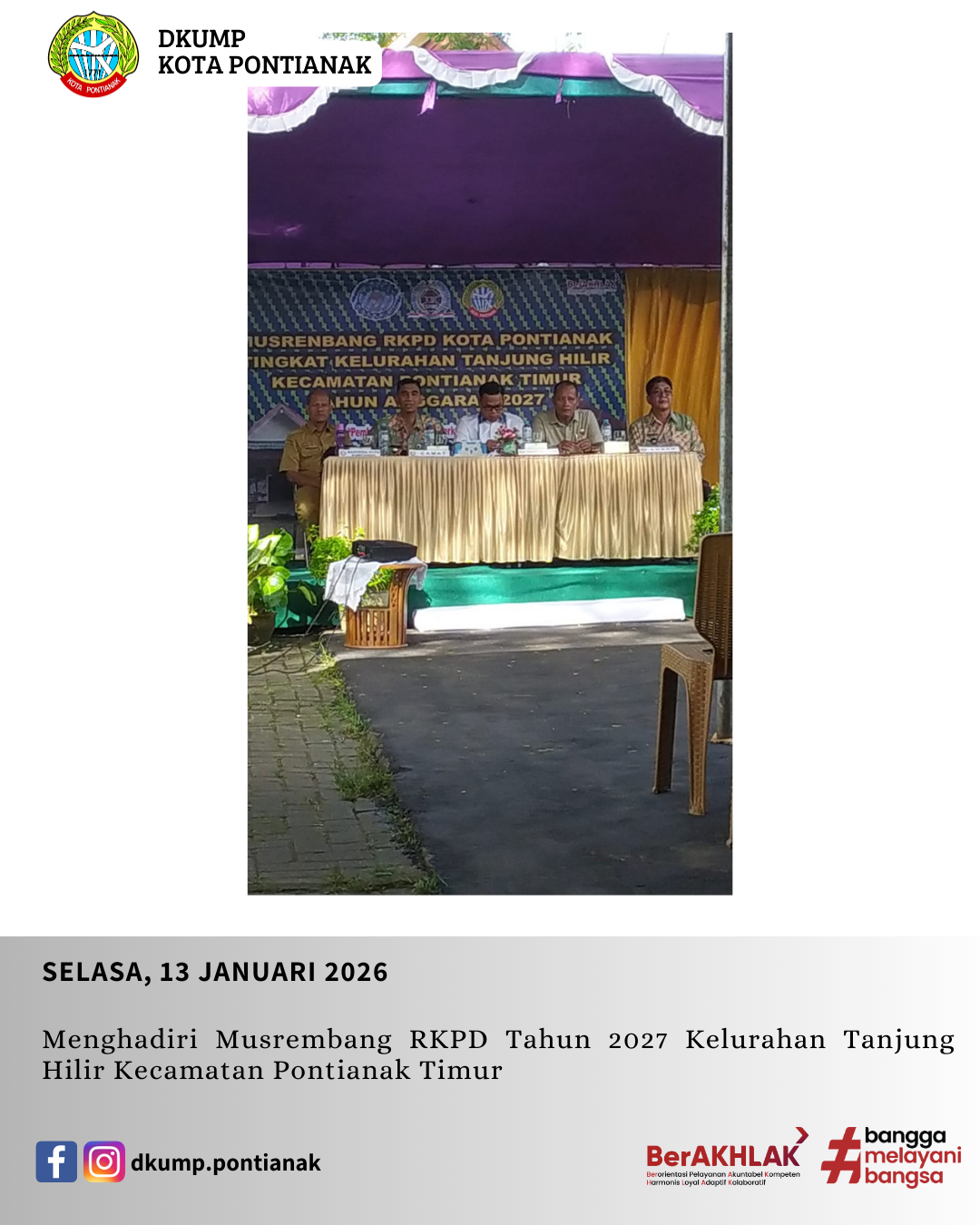 Menghadiri Musrenbang RKPD Tahun 2027 Kelurahan Tanjung Hilir Kecamatan Pontianak Timur Oleh: admin diskumdag 14 Jan 2026 Selasa 13 Januari 2026 Menghadiri Musrenbang RKPD Tahun 2027 Kelurahan Tanjung Hilir Kecamatan Pontianak Timur.