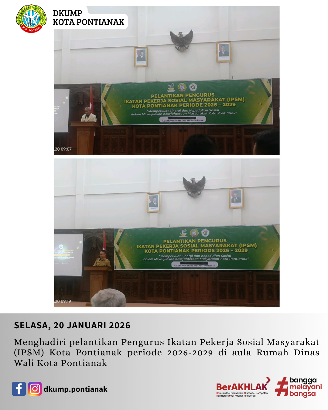 Menghadiri pelantikan Pengurus Ikatan Pekerja Sosial Masyarakat (IPSM) Kota Pontianak periode 2026-2029 di aula Rumah Dinas Wali Kota Pontianak.