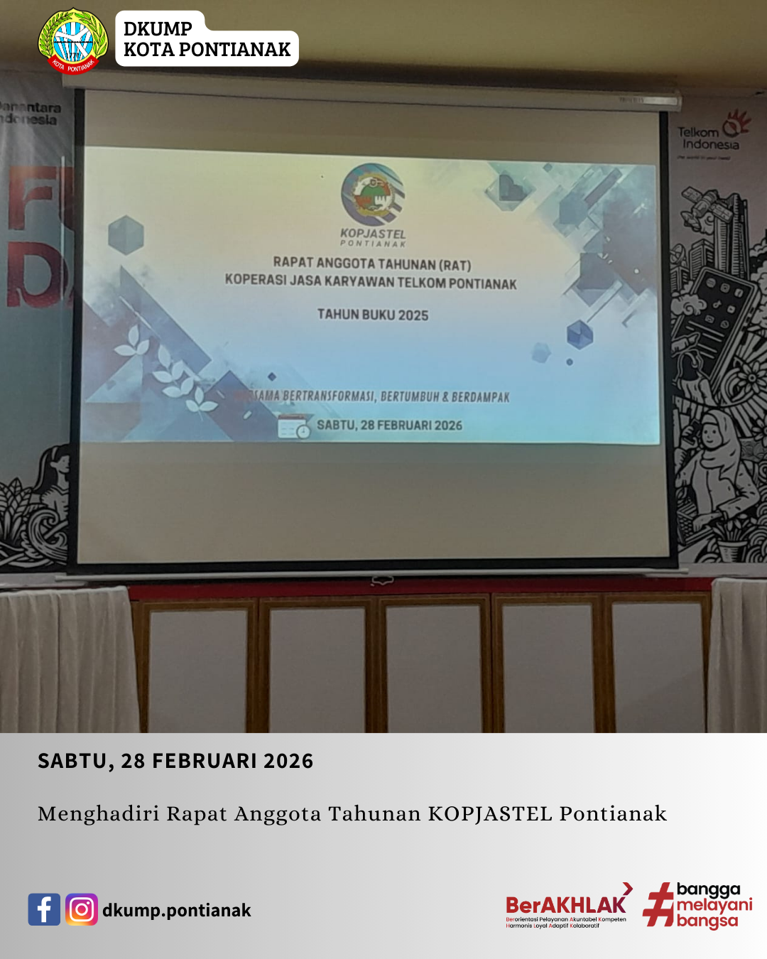 Menghadiri Rapat Anggota Tahunan KOPJASTEL Pontianak Oleh: admin diskumdag 03 Mar 2026 Sabtu, 28 Februari 2026 Menghadiri Rapat Anggota Tahunan KOPJASTEL Pontianak.