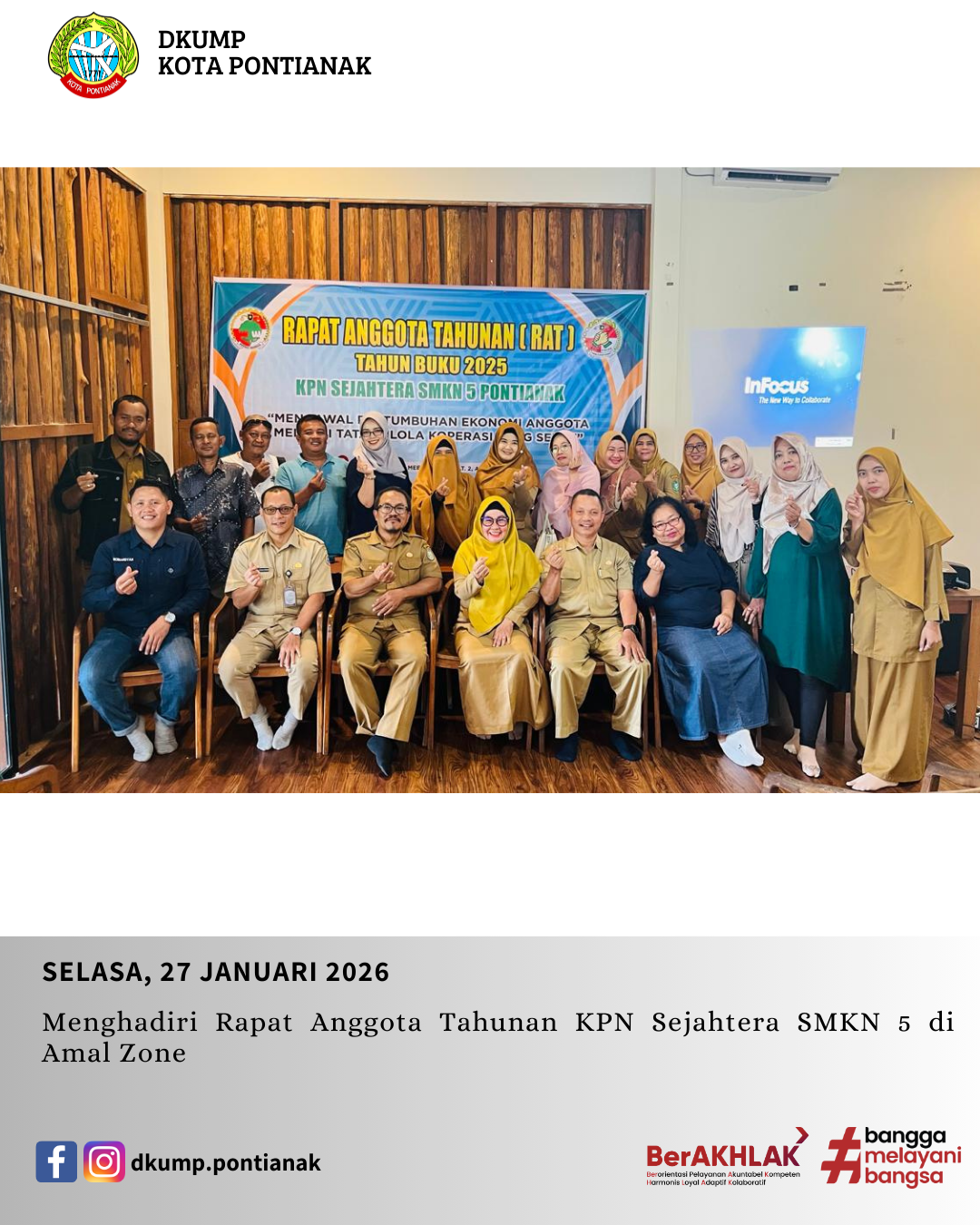 Menghadiri Rapat Anggota Tahunan KPN Sejahtera SMKN 5 di Amal Zone Oleh: admin diskumdag 28 Jan 2026 Selasa, 27 Januari 2026 Menghadiri Rapat Anggota Tahunan KPN Sejahtera SMKN 5 di Amal Zone.