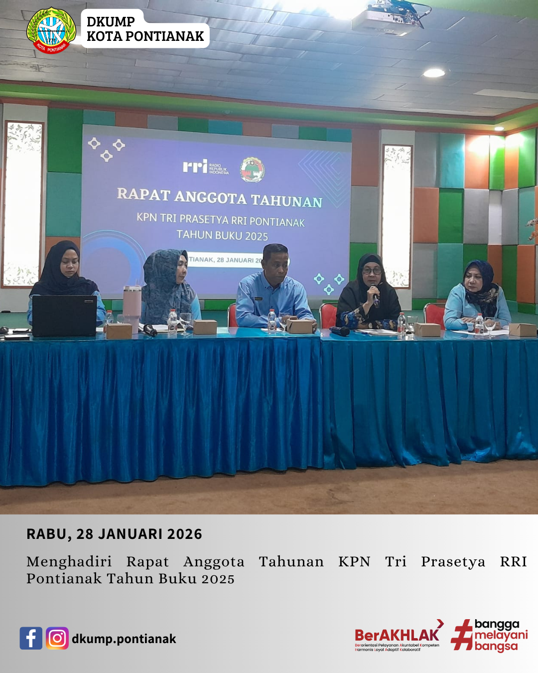 Menghadiri Rapat Anggota Tahunan KPN Tri Prasetya RRI Pontianak Tahun Buku 2025 Oleh: admin diskumdag 29 Jan 2026 Rabu, 28 Januari 2026 Menghadiri Rapat Anggota Tahunan KPN Tri Prasetya RRI Pontianak Tahun Buku 2025.