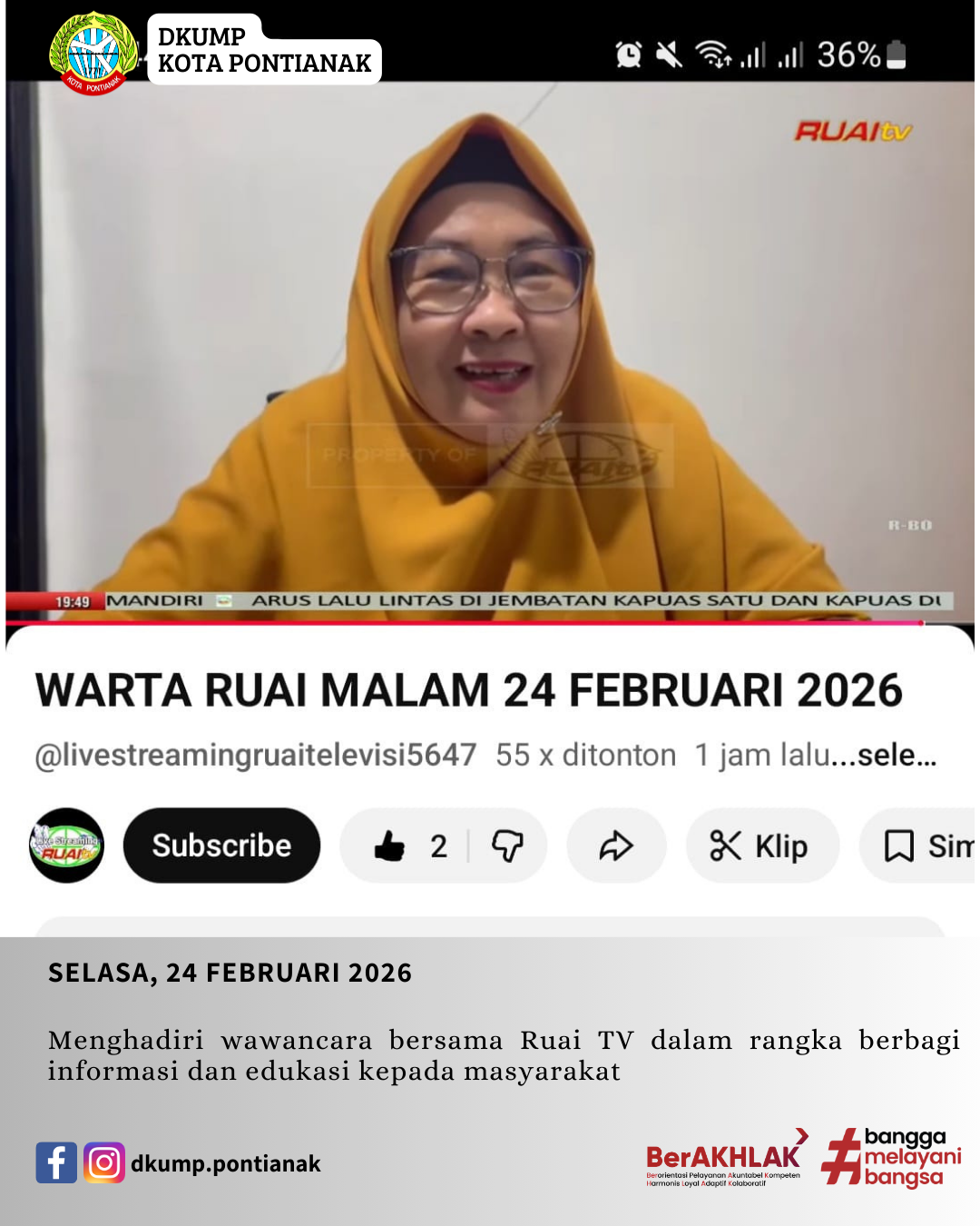 Menghadiri wawancara bersama Ruai TV dalam rangka berbagi informasi dan edukasi kepada masyarakat Oleh: admin diskumdag 27 Feb 2026 Selasa, 24 Februari 2026 Menghadiri wawancara bersama Ruai TV dalam rangka berbagi informasi dan edukasi kepada masyarakat.