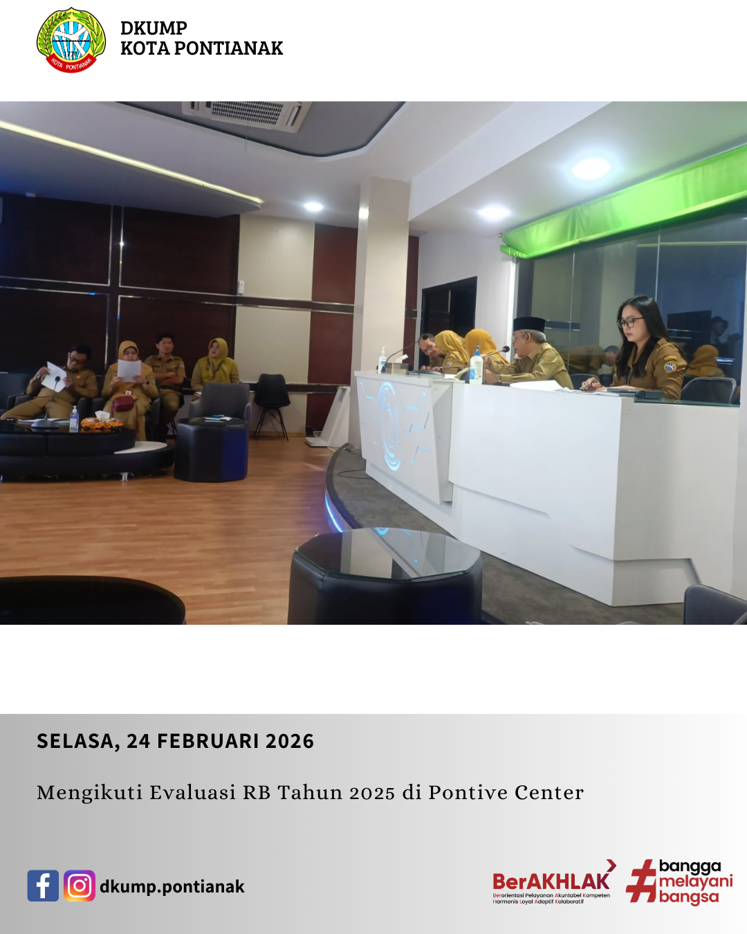 Mengikuti Evaluasi RB Tahun 2025 di Pontive Center Oleh: admin diskumdag 24 Feb 2026 Selasa, 24 Februari 2026 Mengikuti Evaluasi RB Tahun 2025 di Pontive Center.
