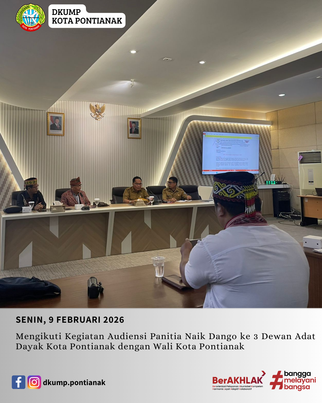 Mengikuti Kegiatan Audiensi Panitia Naik Dango ke 3 Dewan Adat Dayak Kota Pontianak dengan Wali Kota Pontianak Oleh: admin diskumdag 10 Feb 2026 Senin, 9 Februari 2026 Mengikuti Kegiatan Audiensi Panitia Naik Dango ke 3 Dewan Adat Dayak Kota Pontianak dengan Wali Kota Pontianak.