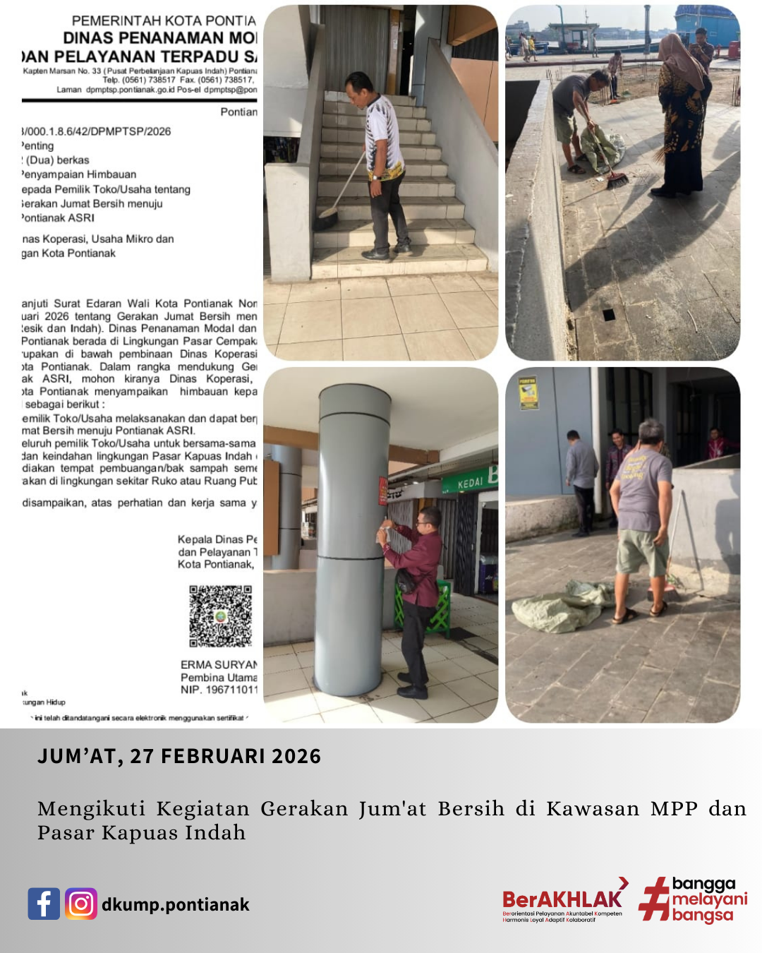 Mengikuti Kegiatan Gerakan Jum'at Bersih di Kawasan MPP dan Pasar Kapuas Indah Oleh: admin diskumdag 27 Feb 2026 Jum’at, 27 Februari 2026 Mengikuti Kegiatan Gerakan Jum'at Bersih di Kawasan MPP dan Pasar Kapuas Indah.
