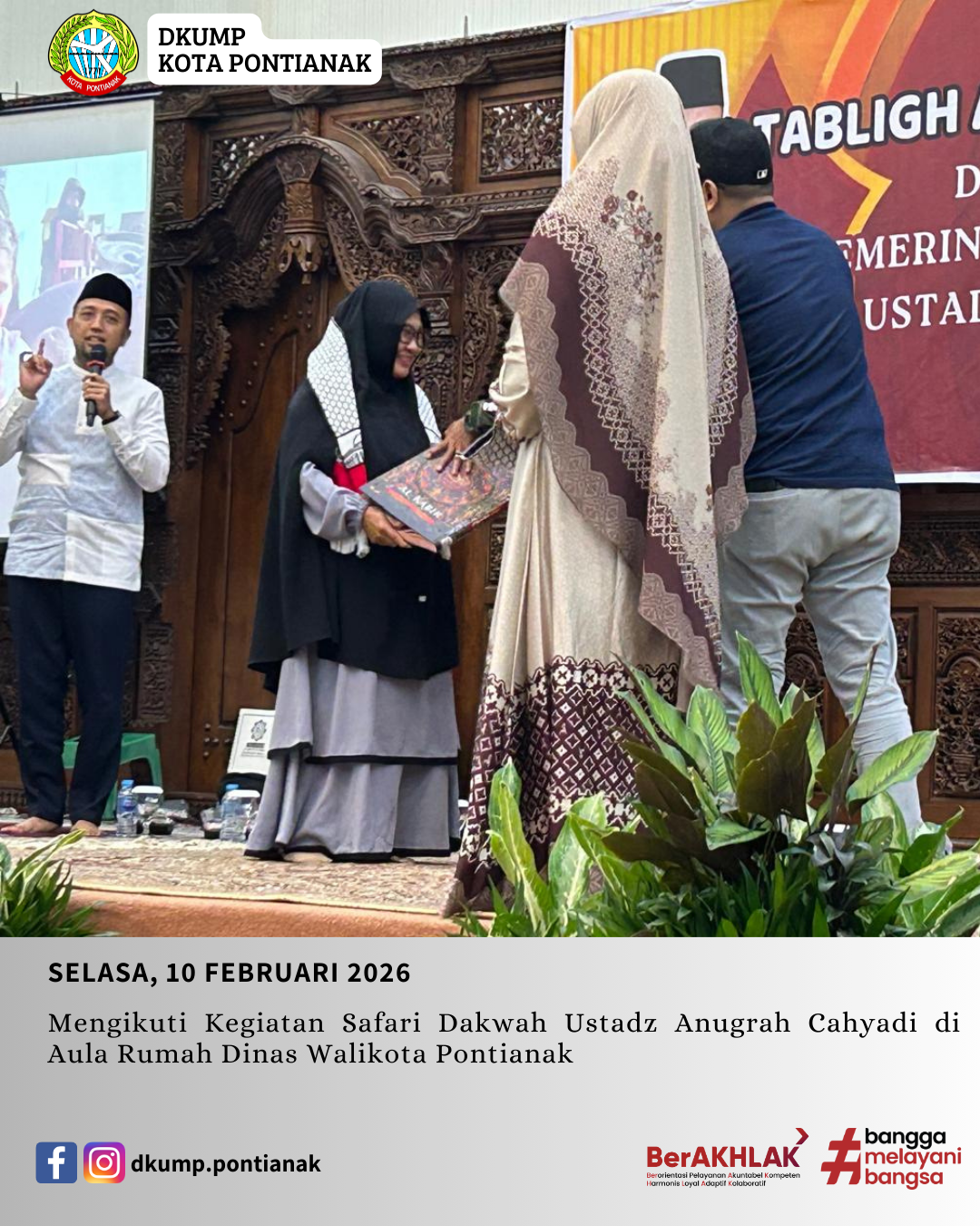 Mengikuti Kegiatan Safari Dakwah Ustadz Anugrah Cahyadi di Aula Rumah Dinas Walikota Pontianak Oleh: admin diskumdag 12 Feb 2026 Selasa, 10 Februari 2026 Mengikuti Kegiatan Safari Dakwah Ustadz Anugrah Cahyadi di Aula Rumah Dinas Walikota Pontianak.