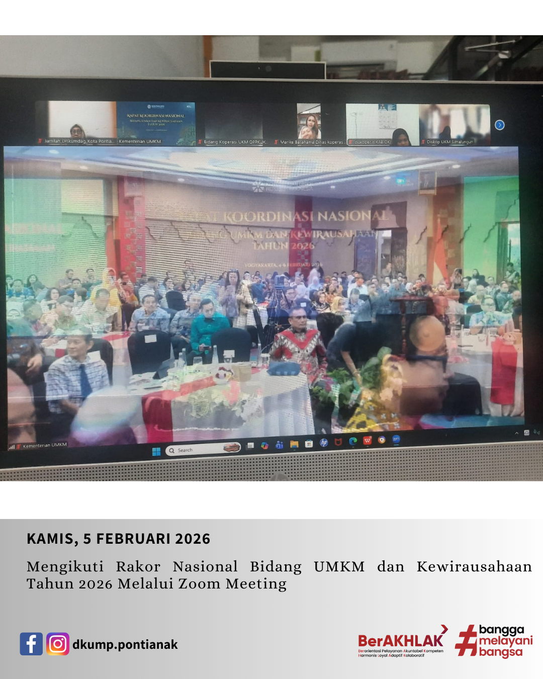 Mengikuti Rakor Nasional Bidang UMKM dan Kewirausahaan Tahun 2026 Melalui Zoom Meeting Oleh: admin diskumdag 06 Feb 2026 Kamis, 5 Februari 2026 Mengikuti Rakor Nasional Bidang UMKM dan Kewirausahaan Tahun 2026 Melalui Zoom Meeting.