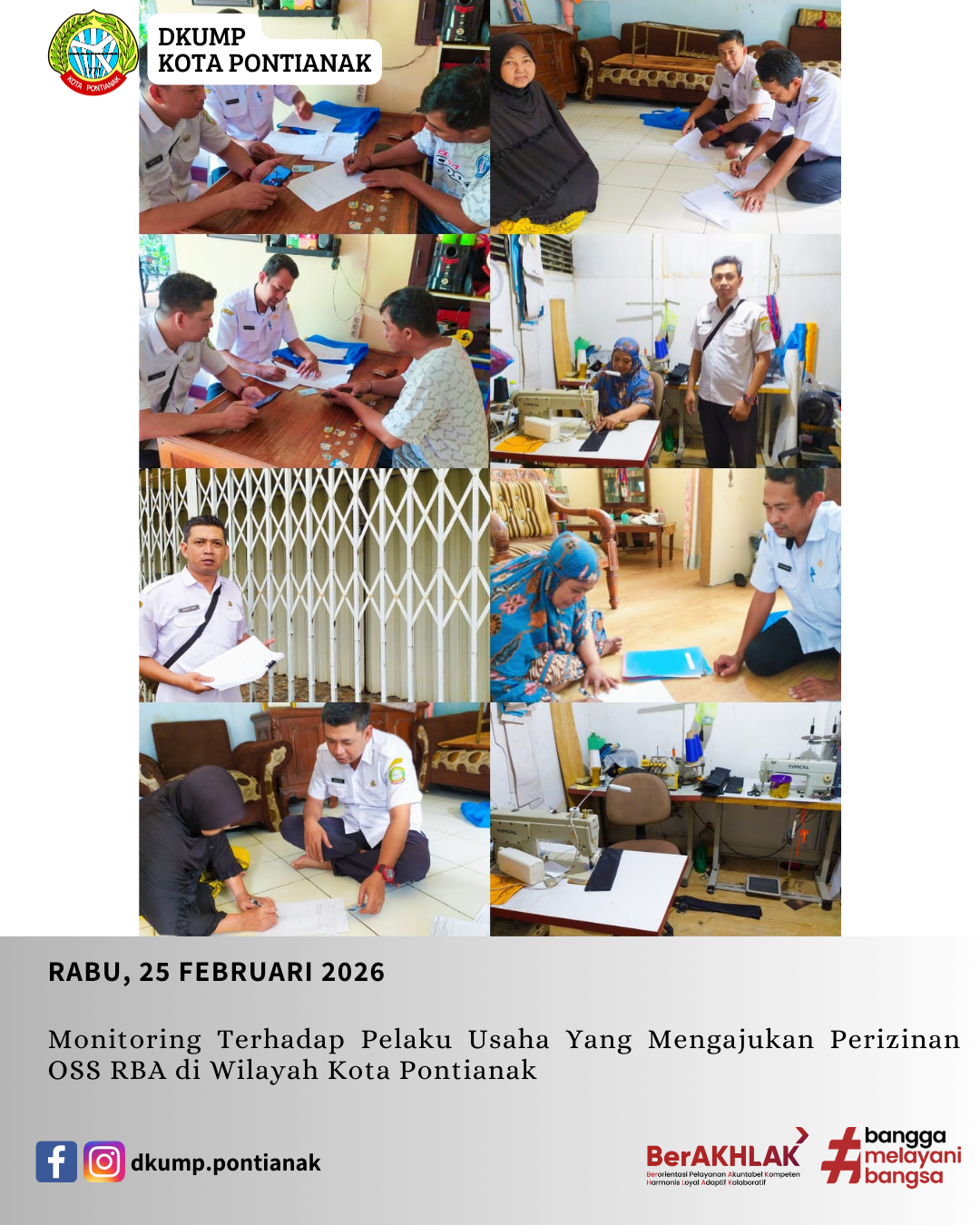 Monitoring Terhadap Pelaku Usaha Yang Mengajukan Perizinan OSS RBA di Wilayah Kota Pontianak Oleh: admin diskumdag 27 Feb 2026 Rabu, 25 Februari 2026 Monitoring Terhadap Pelaku Usaha Yang Mengajukan Perizinan OSS RBA di Wilayah Kota Pontianak.