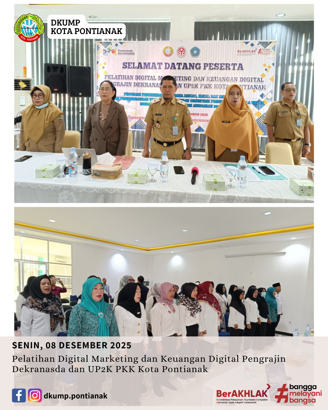Pelatihan Digital Marketing dan Keuangan Digital Pengrajin Dekranasda dan UP2K PKK Kota Pontianak Oleh: Admin 08 Dec 2025 SENIN, 08 Desember 2025Pelatihan Digital Marketing dan Keuangan Digital Pengrajin Dekranasda dan UP2K PKK Kota Pontianak