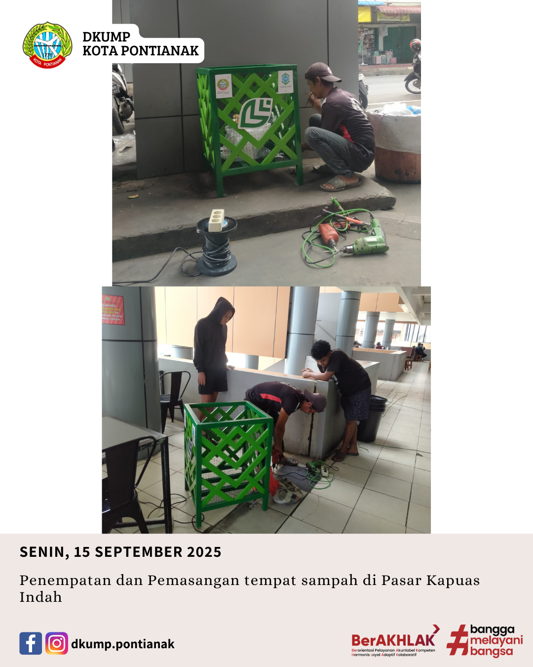 Penempatan dan Pemasangan tempat sampah di Pasar Kapuas Indah Oleh: Admin 15 Sep 2025 SENIN, 15 SEPTEMBER 2025 Penempatan dan Pemasangan tempat sampah di Pasar Kapuas Indah