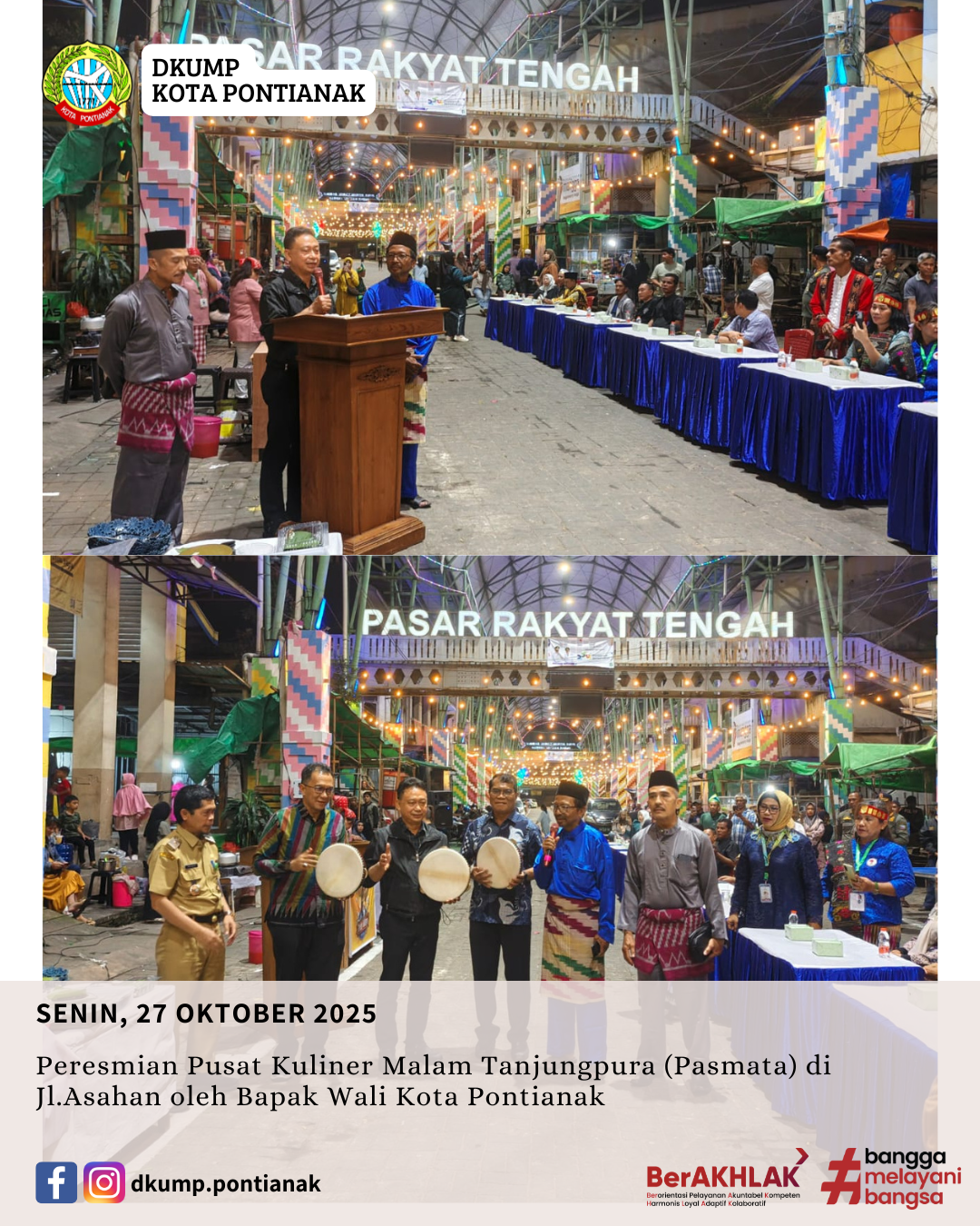Peresmian Pusat Kuliner Malam Tanjungpura (Pasmata) di Jl.Asahan oleh Bapak Wali Kota Pontianak Oleh: Admin 27 Oct 2025 SENIN, 27 OKTOBER 2025 Peresmian Pusat Kuliner Malam Tanjungpura (Pasmata) di Jl.Asahan oleh Bapak Wali Kota Pontianak