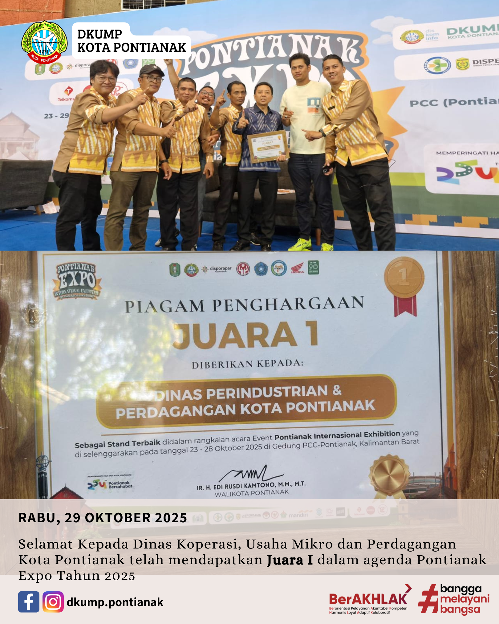 Selamat Kepada Dinas Koperasi, Usaha Mikro dan Perdagangan Kota Pontianak telah mendapatkan Juara I dalam agenda Pontianak Expo Tahun 2025