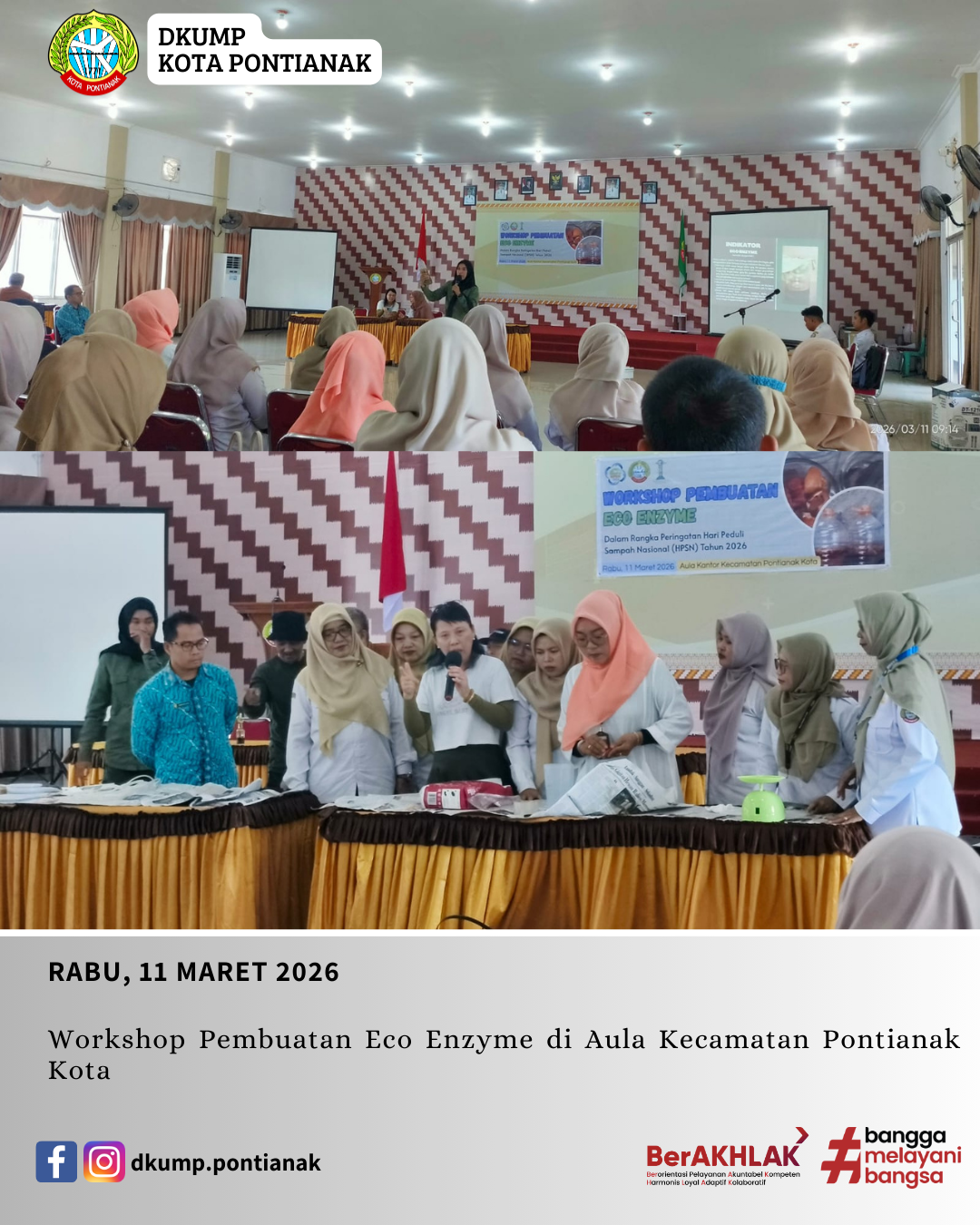 Workshop Pembuatan Eco Enzyme di Aula Kecamatan Pontianak Kota Oleh: admin diskumdag 12 Mar 2026 Rabu, 11 maret 2026 Workshop Pembuatan Eco Enzyme di Aula Kecamatan Pontianak Kota.